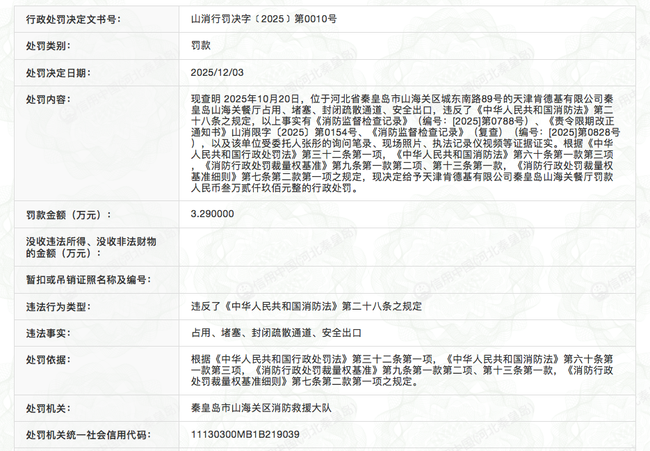 文号“山消行罚决字﹝2025﹞第0010号”行政处罚决定书显示,现查明2025年10月20日,位于河北省秦皇岛市山海关区城东南路89号的天津肯德基有限公司秦皇岛山海关餐厅占用、堵塞、封闭疏散通道、安全出口,违反了《中华人民共和国消防法》第二十八条之规定,以上事实有《消防监督检查记录》(编号:[2025]第0788号)、《责令限期改正通知书》山消限字〔2025〕第0154号、《消防监督检查记录》(复查)(编号:[2025]第0828号),以及该单位受委托人张彤的询问笔录、现场照片、执法记录仪视频等证据证实。